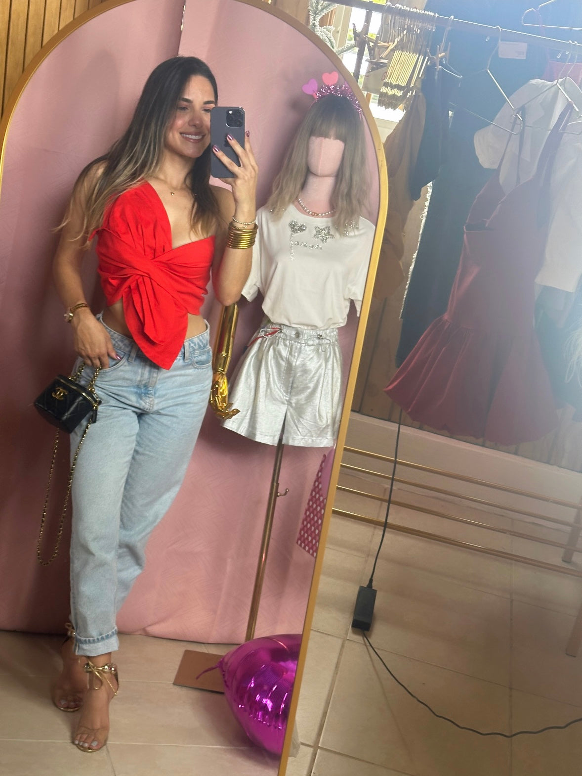 Top corre al size , tiene ajuste en uno de los hombros. Queda hermoso.