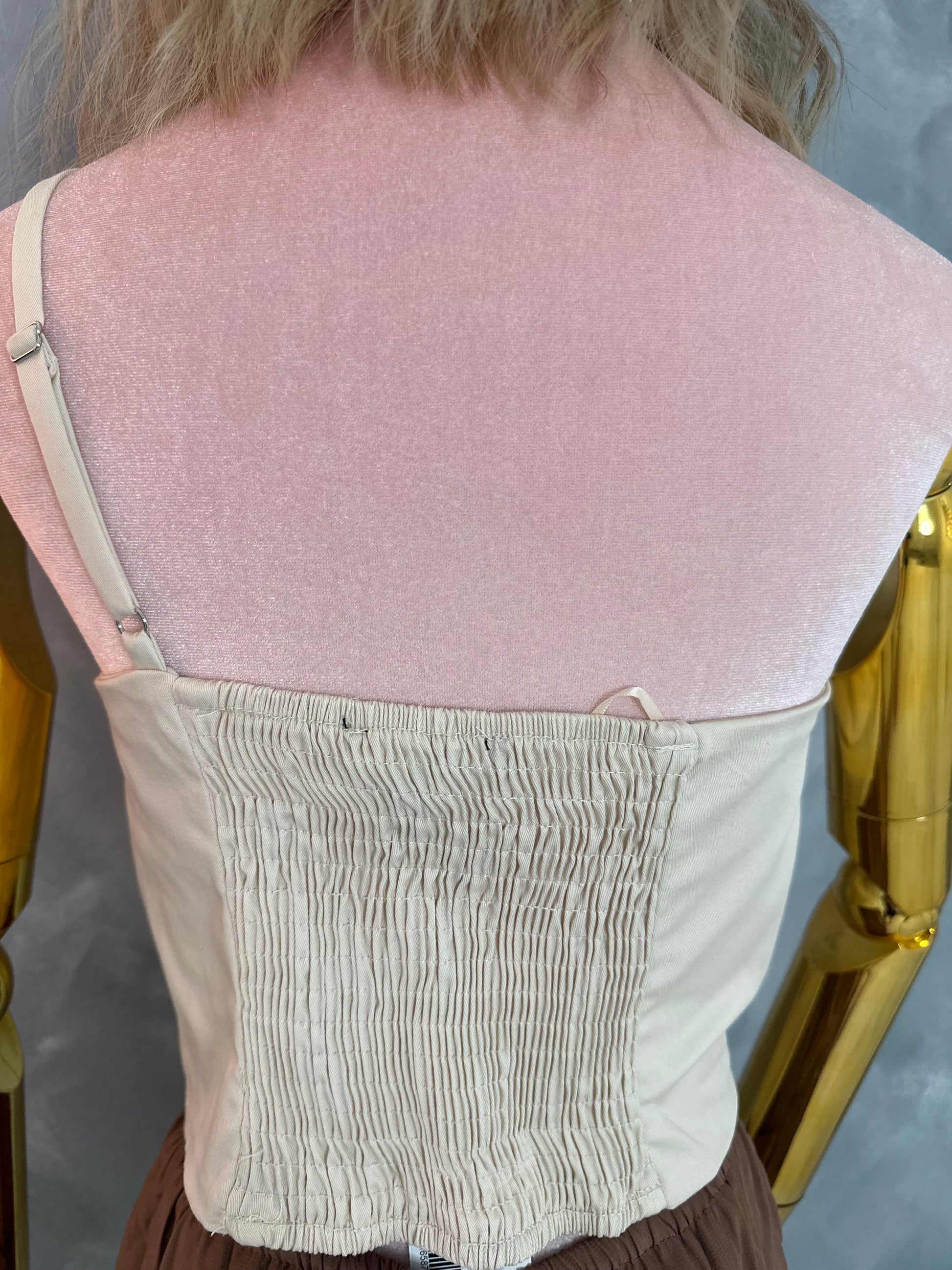Top corre al size , tiene ajuste en uno de los hombros. Queda hermoso.