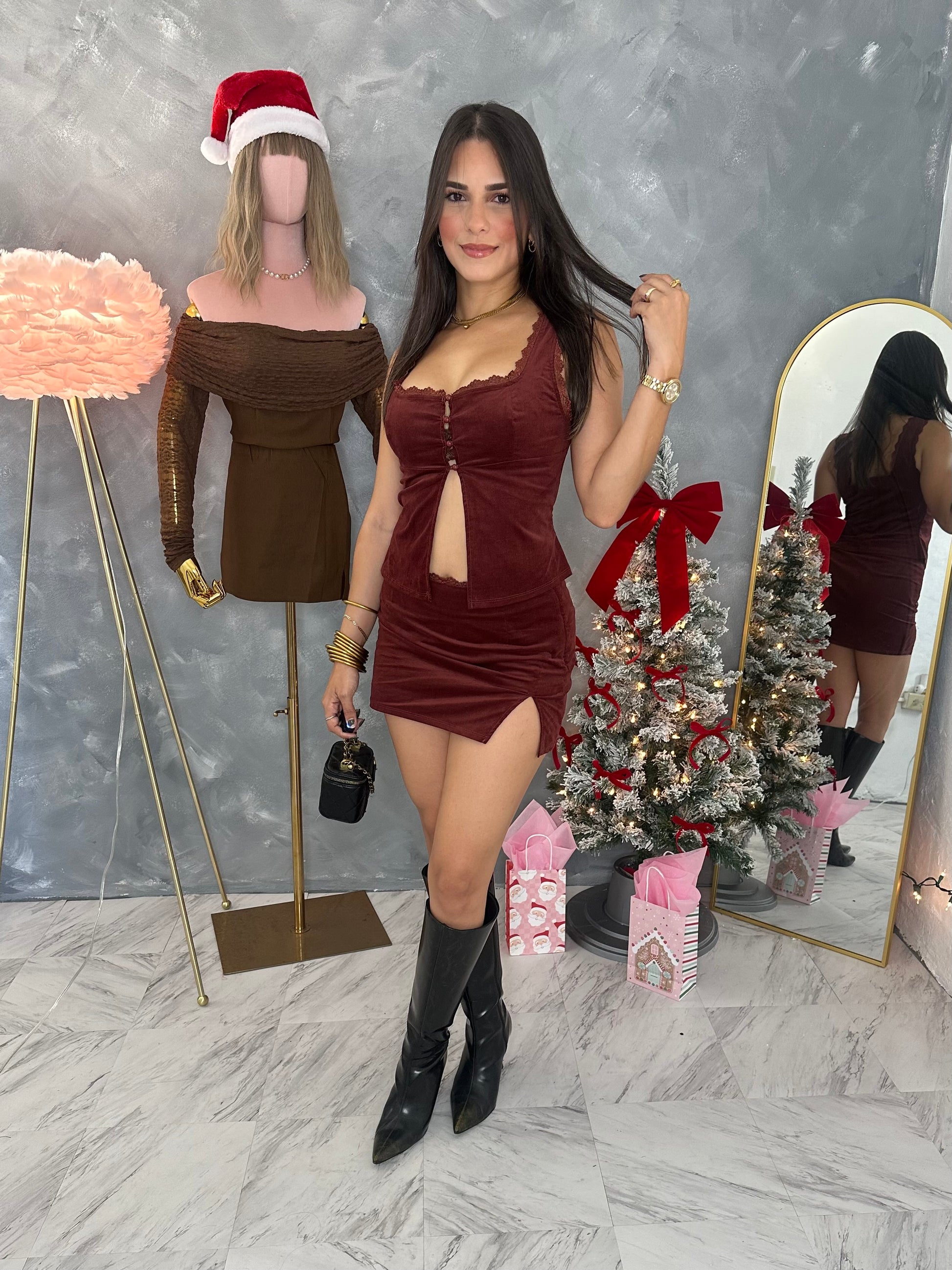 Hermoso set en velvet en tono burgundy color de temporada, corre al size, top tiene un poco de spandex, la falda spande más. Falda no tiene pantalón por debajo, de zipper al lado para cerrar. Corre al size.